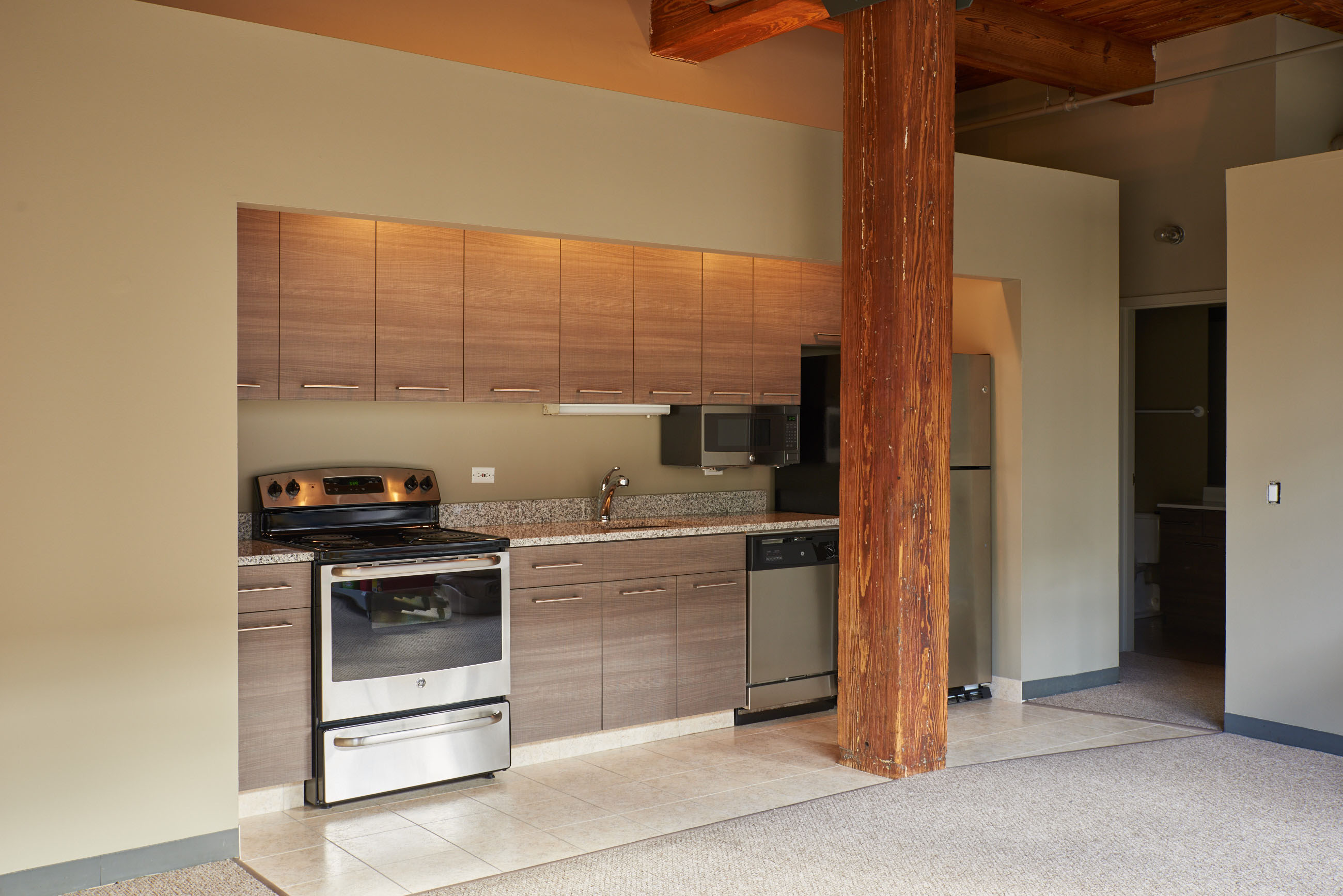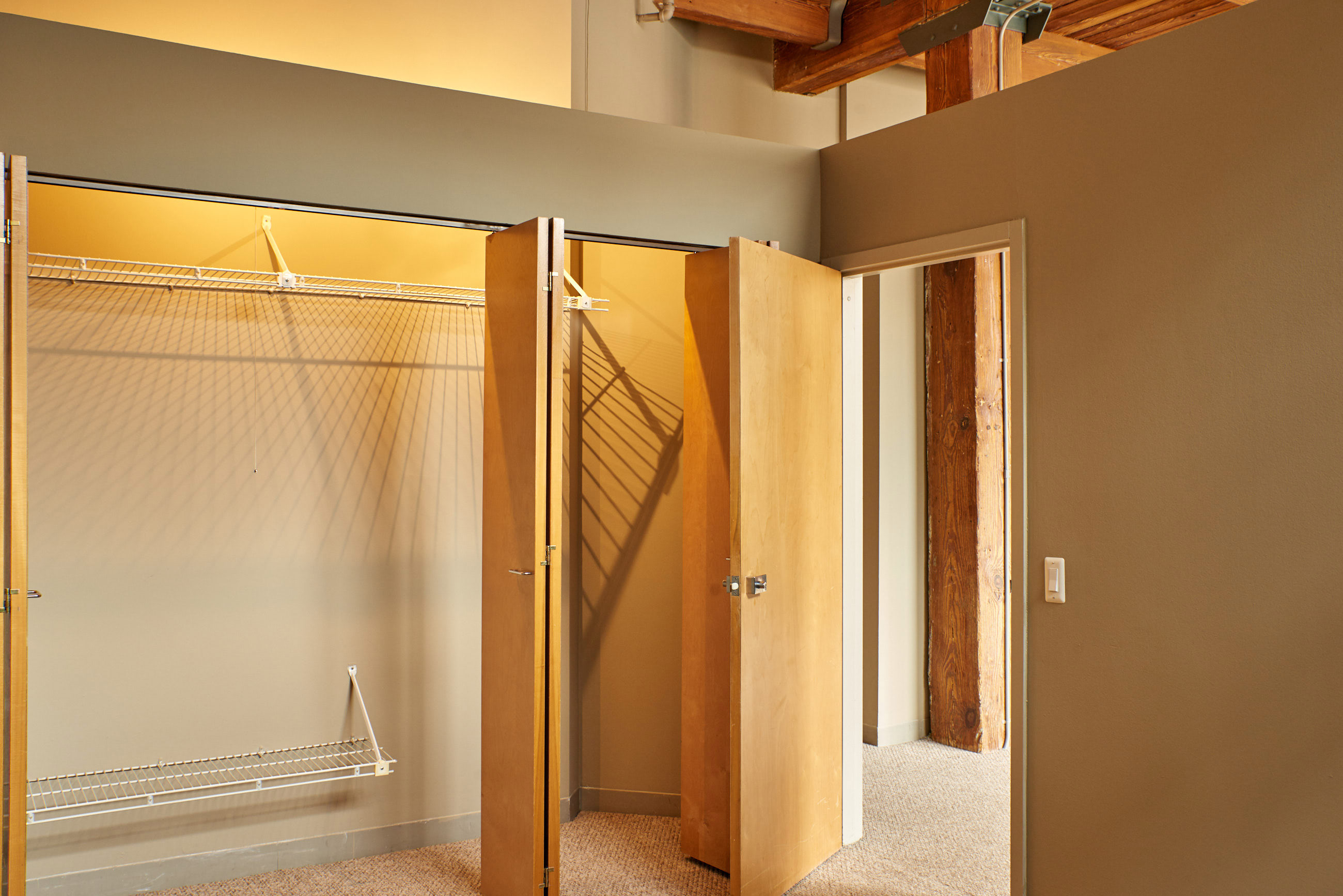 A large, spacious and sunny timber loft with wall-to-wall factory windows, 17 foot timber ceilings and wood-burning fireplace!