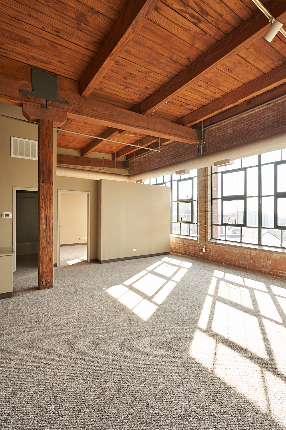 A large, spacious and sunny timber loft with a kitchen pantry and island, wall-to-wall factory windows, 12 foot timber ceilings and wood-burning fireplace!